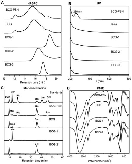 Monosaccharide compositions of the polysaccharides were analyzed by reverse-phase HPLC after PMP precolumn derivatization (Figure 1C). BCG-PSN contained five monosaccharides (mannose, ribose, glucose, arabinose, and traces of galactose), among them glucose was in the highest content. Combined with the result of α-amylase hydrolysis, this indicates that BCG-PSN contains a large portion of glucan (Figure S1, in the supplementary materials). The total polysaccharide BCG was composed of mannose, glucose, and a small amount of arabinose, whereas, the purified polysaccharides BCG-1 and BCG-2 consisted exclusively of mannose and glucose, respectively (Figure 1C).
