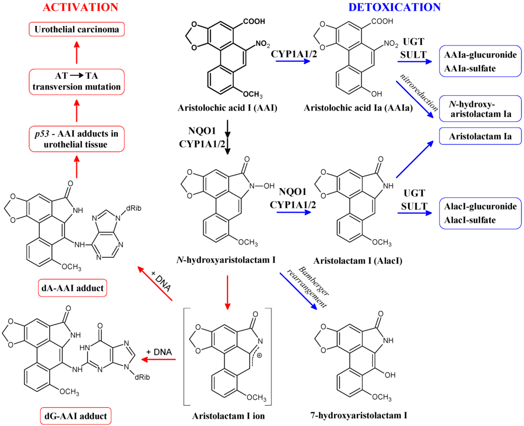 Activation and detoxication pathways of aristolochic acid I (AAI). dA-AAI, 7-(deoxyadenosin-N6-yl)aristolactam I; dG-AAI, 7-(deoxyguanosin-N2-yl)aristolactam I; CYP1A1/2, cytochrome P450 1A1 and 1A2; NQO1, NAD(P)H:quinone oxidoreductase; UGT, UDP glucuronosyltransferase; SULT, sulfotransferase.