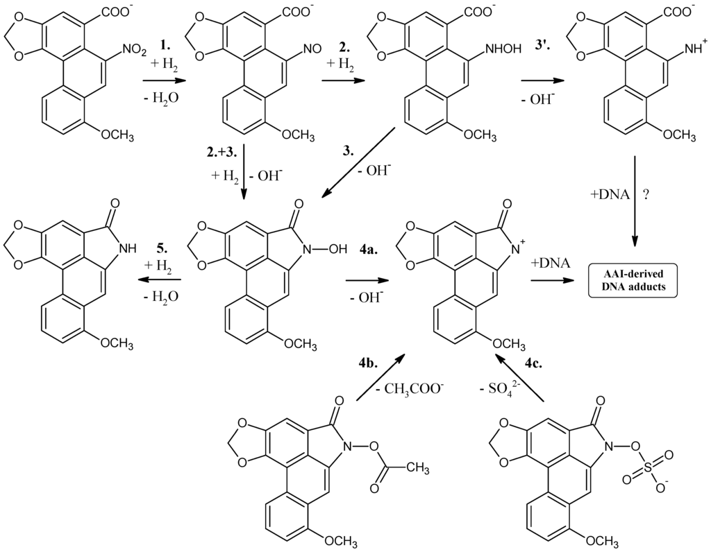 The chemical structures of all AAI-DNA adducts identified indicate that a cyclic ion with a delocalized positive charge (aristolactam I ion) is the ultimate electrophilic species (see Figure 2). The reduction of the nitro group leads to the nitroso and N-hydroxy derivatives (steps 1, 2 and 3 in Figure 3), which are both stabilized by peri interaction. Condensation with the carboxylic acid moiety in peri position leads to a cyclic hydroxamic acid (N-hydroxyaristolactam I), which has been identified in the urine of AA-treated rats [], and is expected to be the precursor of the cyclic ion with a delocalized positive charge (step 4 in Figure 3), which reacts covalently with DNA via the C7 position (Figure 2). The mechanism of N-hydroxyaristolactam I formation has not been elucidated, but the values of standard reaction free energies of individual reductive reaction steps suggest the above mentioned mechanism, namely condensation of the nitroso and N-hydroxy derivatives with the carboxylic acid moiety in peri position (steps 2 and 3 in Figure 3) as most probable.