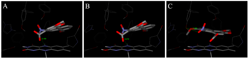 The binding orientations resulting from molecular docking calculations facilitating the hydride transfer from N5 of the isoalloxazine ring of reduced FAD of human NQO1 to the oxygen of AAI. The two possible forms of the reduced isoalloxazine ring (ionized enolate and protonated enol) bound to the NQO1 active site are labeled (A) and (B), respectively. Binding orientations favoring a proposed alternative three-step (e−, H+, e−) reduction is labeled as (C). AAI and its derivative, FAD cofactor and amino acids residues within 5.5 Å from ligand are rendered as bold sticks, and sticks and lines, respectively [,].