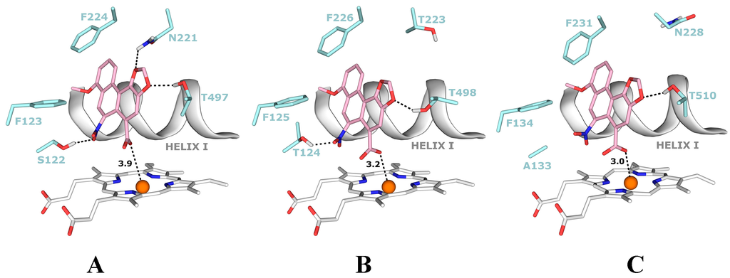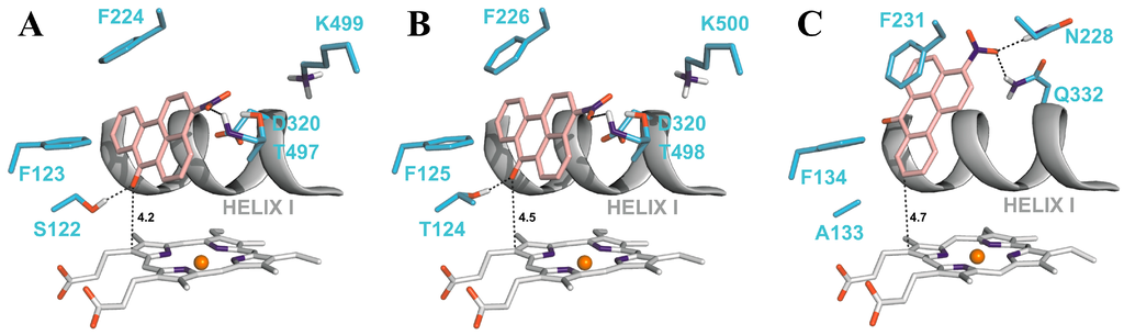 Predicted binding free energies, distances between the 3-NBA ligand and a heme cofactor, and orientations of 3-NBA binding in the active sites of CYP1A1, 1A2 and 1B1 are similar. This is also true for the AAI ligand (Table 5, Figure 6 and Figure 7).