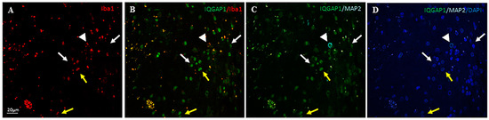 Regarding IQGAP1−Iba1 coexpression experiments, while few IQGAP1+ cells did not co-stain with Iba1 (white arrows in Figure 3), many others were positive for Iba1 (Figure 3 yellow arrows in A–D; white arrows in E–H), confirming the macrophage lineage of such cells. Frequently IQGAP1+/Iba1+ macrophages were detected in areas of high micro-vessel concentration (Figure 3E–H; Supplementary Materials, Figure S3).