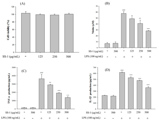 Macrophages were seeded at 5 × 104 cells/well in 96-well plates. Cells were incubated with SS-1 (125, 250 and 500 μg/mL) in the presence of LPS (100 ng/mL) for 24 h. Cell culture supernatants were centrifuged at 5000× g for 3 min at 4 °C to remove insoluble material. Secreted IL-1β, IL-10, IL-6, and TNF-α were measured in cell culture supernatants using commercially-available ELISA kits (BioLegend, San Diego, CA, USA) following the instructions provided by the manufacturers. The absorbance (450 nm) for each sample was analyzed using microplate reader and was interpolated with a standard curve. Results of three independent experiments were used for statistical analysis.