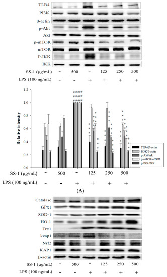 Effects of SS-1 on TLR4/PI3K/Akt/mTOR/IKK protein expression (A); and anti-oxidative enzymes, HO-1, Trx-1, and Nrf2/KAP1 protein expression (B) in LPS-induced RAW264.7 cells. Cells were incubated with or without LPS (100 ng/mL) in the presence of various concentrations (125, 250 and 500 μg/mL) of SS-1 for 24 h. The data were presented as mean ± SD for the three different experiments performed in triplicate; ## p < 0.01, and ### p < 0.001 were compared with sample of control group (one-way ANOVA followed by Scheffe’s multiple range tests); ** p < 0.01 and *** p < 0.001 were compared with LPS-alone group.
