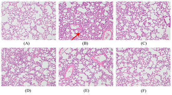 In Figure 4, a histological section of lung tissue shows significant thickening of edema and leukocyte infiltration in the alveoli and interstitial space of the tissue in the samples induced with LPS. The administration of SS-1 and Dex prior to LPS induction could alleviate edema and leukocyte infiltration in the alveoli and interstitial space.