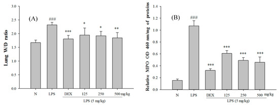 The lungs were homogenized, 12,000× g at 4 °C for 15 min and resuspended in 50 mM KPO4 buffer (pH 6.0) with containing 0.19 mg/mL of o-dianisidine chloride and 0.0005% H2O2 was a substrate for myeloperoxidase at 460 nm with a spectrophotometer (Molecular Devices, Sunnyvale, CA, USA). MPO content was expressed as relative MPO activity (OD 460 nm/mg protein of lung tissue).