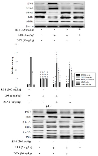 Effects of SS-1 on iNOS, COX-2, IκBα, p-IκBα, and NF-κB protein expression (A); and MAPK phosphorylation (B) in LPS-induced RAW264.7 cells. Cells were incubated with or without LPS (100 ng/mL) in the presence of various concentrations (125, 250 and 500 μg/mL) of SS-1 for 24 h. The data were presented as mean ± SD for the three different experiments performed in triplicate; ## p < 0.01, and ### p < 0.001 were compared with sample of control group (one-way ANOVA followed by Scheffe’s multiple range tests); * p < 0.05, ** p < 0.01 and *** p < 0.001 were compared with LPS-alone group.