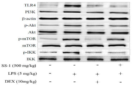 In addition, we also analyzed the expression levels of proteins associated with the TLR4/PI3K/Akt/mTOR/IKKβ signal transduction pathway. As shown in Figure 8A, LPS-induced group exhibited significant increase in TLR4 and PI3K protein expression levels and upregulation of Akt, mTOR, and IKKβ protein expression levels when compared with those of the control group. On the contrary, SS-1-treated group exhibited significantly suppressed activity of the TLR4/PI3K/Akt/mTOR/IKKβ signal transduction pathway when compared with that of the LPS-induced group.