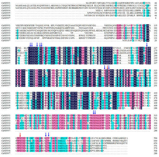 Alignment of the deduced amino acid sequences of the seven pepper neutral/alkaline invertases. Dark-blue shading, pinkish shading and light blue shading reflect 100%, 75% and 50% amino acid residues conservation, respectively. The catalytic residues and substrate-binding residues are depicted by red and blue arrows, respectively.