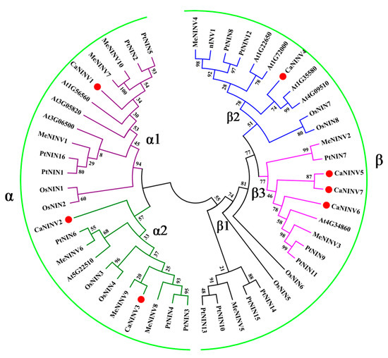 To determine the evolutionary relationship among the plant alkaline/neutral invertase (NINV) proteins, sequences of 51 NINV family members from Capsicum annuum, M. esculenta, Populus trichocarpa, A. thaliana, and O. sativa were analyzed using a Neighbor-Joining (NJ) phylogenetic tree. These plant NINV proteins were classified into two groups (α and β groups) (Figure 2). CaNINV1, 2, and 3 were classified in the α group. CaNINV4, 5, 6, and 7 were classified in the β group. In the α group, CaNINV1 had a close relationship with MeNINV7, 10, and PtNIN2, 5, and these genes were grouped into the α1 group. CaNINV2 and 3 shared 69.10% amino acid identity and showed a close relationship, so they were grouped into the α2 group, while CaNINV2 and MeNINV9 formed a clade. In the β group, CaNINV4 had a close relationship with At1G35580 and At4G09510, and these genes were grouped into the β2 group. CaNINV5, 6, and 7 had a close relationship and were grouped into the β3 group. In addition, CaNINV5 and 7 formed a clade, with 73.08% amino acid similarity.