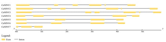 In order to gain further insight into the evolutionary relationships of CaNINVs, the exon–intron structure for each member of this family was analyzed. The number of exons in CaNINV genes ranged from three to six (Figure 3). Among the α group members, CaNINV1, 2, and 3 had six exons, and their fifth exon was the smallest one among all of the exons in CaNINVs. Among the β group members, CaNINV4, 5, and 6 had four exons, and the exon–intron structures of CaNINV5 and 6 were similar. CaNINV7 had only three exons.