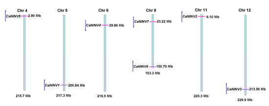 The chromosomal distribution and orientation of CaNINV genes were also identified. The results showed that the seven CaNINV genes are mapped to six chromosomes of the pepper genome (Figure 4). No tandem duplication of the pepper CaNINV genes was found. CaNINV5, 1, 2, and 3 had the same orientation and are present on chromosome 4, 5, 11, and 12, respectively. CaNINV4 was found to be present on chromosome 6, while CaNINV6 and 7 were mapped to chromosome 8, with opposite orientation.