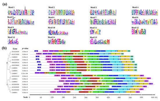 The conserved motifs of NINV proteins from C. annuum and A. thaliana according to the phylogenetic analysis. (a) The motif sequences in NINVs, which were identified by MEME. The catalytic residues are indicated by black arrow; (b) The motif distribution in NINVs. The NJ tree was constructed with full amino acid sequences of CaNINVs and AtNINVs using Muscle and MEGA7 software with 1000 bootstraps. Gray lines represent the non-conserved sequences, and each motif is indicated by a colored box and numbered at the box. The length of the motifs in each protein is shown proportionally.