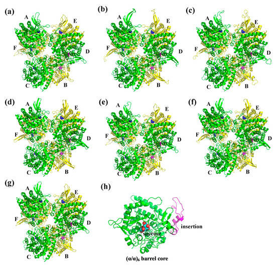 Cartoon representation of the predicted three-dimensional structure models of CaNINV1–6. (a) CaNINV1; (b) CaNINV2; (c) CaNINV3; (d) CaNINV4; (e) CaNINV5; (f) CaNINV6; and, (g) NINV protein from Anabaena; (h) the monomer of CaNINV1. The six subunits are sequentially labeled as A–F. The spherical structures indicate sucrose molecules. The image was generated using the PyMOL program (Schrödinger, Inc., New York, NY, USA).