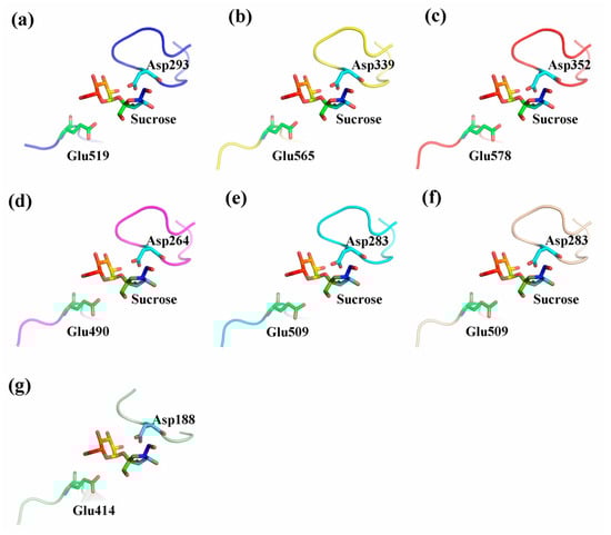 Predicted catalytic residues of CaNINV1–6 with sucrose molecules. (a) CaNINV1; (b) CaNINV2; (c) CaNINV3; (d) CaNINV4; (e) CaNINV5; (f) CaNINV6; (g) NINV protein from Anabaena (Protein Databank ID 5GOR). Colored stick structures indicate sucrose molecules. Green stick and blue stick structures represent the catalytic residues of Glu and Asp, respectively. The image was generated using the PyMOL program (Schrödinger, Inc., New York, NY, USA).