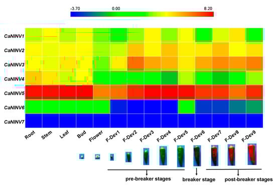To establish the spatio-temporal expression patterns of CaNINV genes, the RNA-seq data from different tissues and developmental stages (root, stem, leaf, buds, flower, and nine stages of developing fruits) of pepper cultivar Zunla-1 [] were used to generate a heat map. The expression pattern of each CaNINV gene was significantly different across different tissues and developmental stages (Figure 8). The expression of CaNINV1 and CaNINV6 were low in all of the tested tissues, and no expression of CaNINV7 was detected. CaNINV4 was mainly expressed in the root, and a lower expression was observed in fruits. The expression of CaNINV2 and CaNINV3 in fruits was higher than in rest of the tissues. Surprisingly, the expression of CaNINV5 was the highest among all the CaNINV genes in all of the tested tissues. The expression of CaNINV5 in the root, stem, leaves, and buds was similar, and was lowest in the flowers. During pepper fruit development, the expression of CaNINV5 gradually increased at the pre-breaker stages, followed by a decrease at the breaker stages, and maintained a low level at the post- breaker stages.