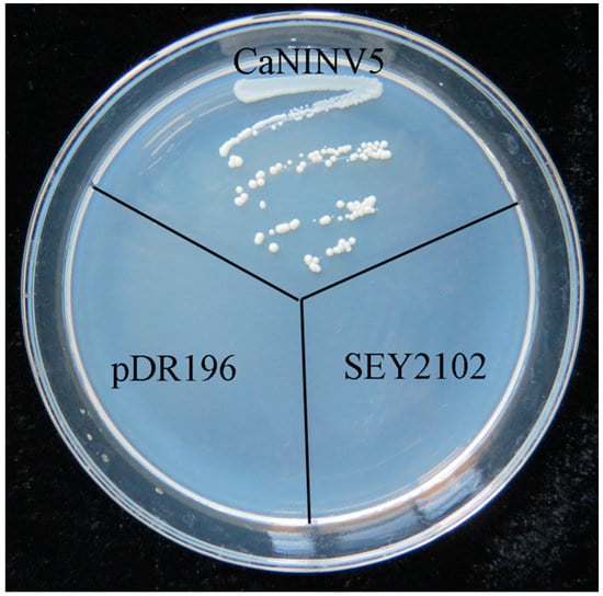 CaNINV5 was the most highly expressed CaNINV gene across the different tissues and developmental stages of pepper. Therefore, its activity was further examined in the yeast triple mutant SEY2102, which lacks endogenous invertase activity. This yeast mutant is unable to grow on a medium with sucrose as the sole carbon source. First, the cDNA of CaNINV5 was inserted into a yeast expression vector pDR196 to generate pDR196-CaNINV5. The results showed that yeast cells transformed with the empty pDR196 vector could not grow on the selection medium containing sucrose, whereas the yeast cells that were transformed with pDR196-CaNINV5 could grow on this medium (Figure 9). This result suggested that CaNINV5 has an invertase activity.