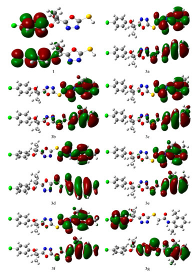 The energy of frontier orbital’s, namely, the Highest Occupied Molecular Orbital (HOMO) and Lowest Unoccupied Molecular Orbital (LUMO) are very popular parameters from quantum chemistry and calculations provide valuable information about molecular systems. The energy gap between HOMO and LUMO (Egap) measures the kinetic stability of the molecule [27]. A large value of the energy gap implies high kinetic stability and low chemical reactivity. Furthermore, the energy gap between HOMO and LUMO explains the intermolecular charge transfer (ICT) within the molecule, which is responsible for the bioactivity of the molecule. The distribution pattern of the FMOs has been illustrated in Figure 6. In all the studied derivatives 3a–3i, except 1 in which HOMOs delocalized on 4-chlorophenoxygroup, the HOMOs had leading contribution from N-arylacetamide and the adjacent sulfur atom. Similarly, LUMOs also had a dominating contribution from the N-arylacetamide moiety except for 3g, 3h, and 1 which had a major contribution from the 4-chlorophenoxy group. However, in the case of 3i HOMOs delocalized on both benzene rings along with acetamide groups. The ICT has been observed from N-arylacetamide to the 4-chlorophenoxy group units in 3g and 3h.