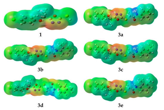 The molecular electrostatic potential surfaces of the oxadiazoles derivatives. Color code of atoms: C—grey, Cl—light green, H—light grey, N—blue, O—red, S—yellow.