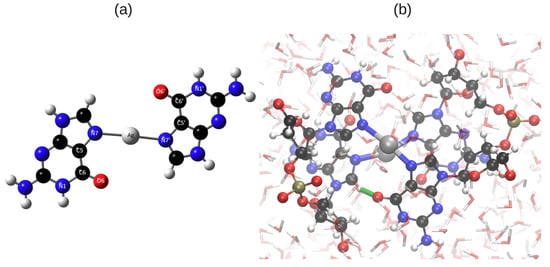 To unveil the atomic structure of the Ag-mediated guanine duplex in water, we have previously performed QM/MM molecular dynamics calculations for the smallest Ag-mediated guanine duplex G-Ag-G, namely the Ag-mediated guanine tetramer []. Silver and DNA atoms were treated at the DFT level. Solvation was modeled with a 4 nm box of classical water molecules and the Amber force field []. The calculations were carried out with the CP2K code [], and the Perdew–Burke–Ernzerhof (PBE) exchange and correlation potential []. Grimme’s D3 dispersive corrections were used to account for long-range van der Waals interactions []. Before the QM/MM simulations, the system was first equilibrated at 300 K with a classical NVT run of 2 ns, using the Amber force field. Then the QM/MM simulations were performed for 21 ps with a time-step of 0.5 ps. In the QM/MM simulations, van de Waals interactions between the QM and MM regions were approximated by classical force fields. Electrostatic interactions between the two subsystems were accounted for using an embedding approach, where point charges located at the water molecules (MM region) can polarize the Ag-mediated DNA (QM region). By comparing the root mean square distance of the heavy atoms to the initial structure positions, we can conclude that the system reached an equilibrium regime after 16 ps. Therefore, we used only the last 5 ps of the trajectory for analysis. Further details of these simulations can be found in Reference [].