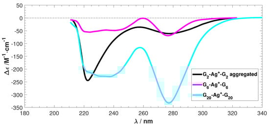 The experimental electronic circular dichroism (ECD) spectra of Ag stabilized G, G, and G. is differential molar extinction coefficients = −, is the wavelength. Data reproduced with permission from Swasey, S. and Gwinn, E. New J. Phys. 2016, 18, 045008–045025. [].