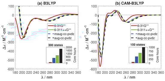 (main figures) The effects of basis sets and exchange correlation-functional on the ECD spectrum of a single snapshot structure and (inset figures) the related cpu time costs. (a) B3LYP; (b) CAM-B3LYP.
