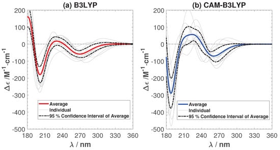 The average and individual ECD spectra of ten sampled structures with B3LYP (a) and CAM-B3LYP (b). Spectra are not shifted, but presented as calculated.