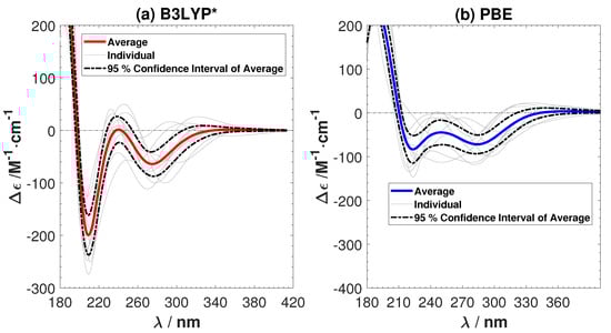The average and individual ECD spectra of ten sampled structures with (a) the B3LYP* (15% Hartree–Fock (HF) exchange) and (b) the Perdew–Burke–Ernzerhof (PBE) functionals. No shiftings of the calculated spectra are done.