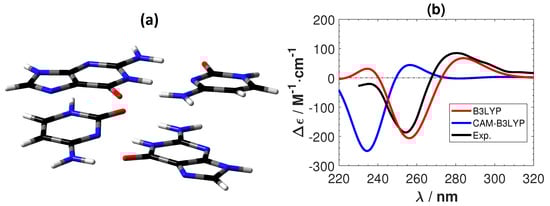 B3LYP adequately predicts ECD spectra for many organic molecules [,]. However, CAM-B3LYP is a functional built to overcome the deficiencies of B3LYP and to correctly describe charge transfer, local excitations, and Rydberg excitations []. It has been assessed for a broad set of small main group and organic molecules [], and has been demonstrated to outperform B3LYP for chiral alkenes [], chiral aromatic nitro compounds [], and metal-porphyrin complexes []. It is very interesting to understand why for our Ag-guanine system, CAM-B3YLP gives less accurate ECD spectra than B3LYP. For this purpose, we first tested the two functionals on two DNA systems without metal ions: one is a C-G tetramer taken from a reported B-DNA structure (9BNA in the protein data bank), and another is a G-G tetramer taken from the same sample used in Figure 3, in which the Ag atoms were deleted.