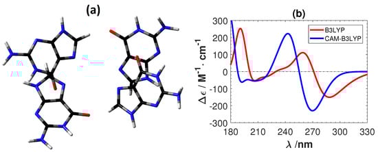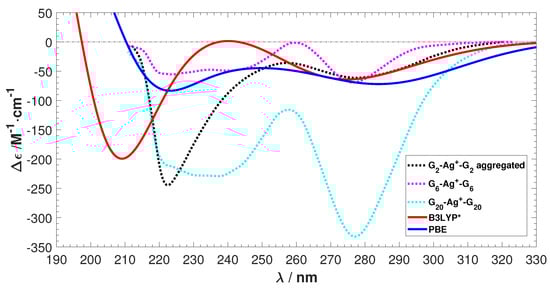 The experimental ECD spectra for three Ag-mediated guanine species obtained from Reference [] are shown in Figure 2. The spectra of G-Ag-G and G-Ag-G exhibit similar features, but the G-Ag-G spectrum differs. This is possibly due to aggregation induced by the Ag ions, which prevents a comparison of the intensity between the predicted and the experimental ECD [,,]. However, G-Ag-G presents a good model system to study the ECD of Ag-mediated guanine duplexes, especially in terms of the negative peak locations and the absence of any positive peaks.