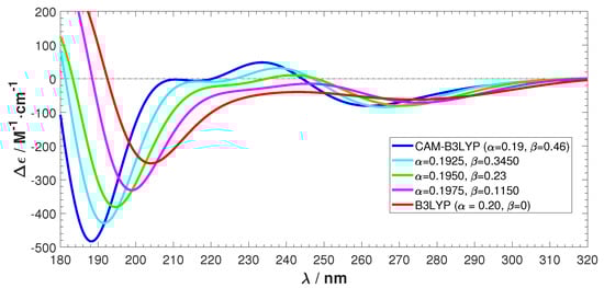 To further investigate the difference between B3LYP and CAM-B3LYP in our system, we calculated the ECD spectra of a sampled structure by gradually changing CAM-B3LYP to B3LYP. This was done by changing the short-range parameter and the long-range parameter in the definition of Coulomb-attenuation range []: