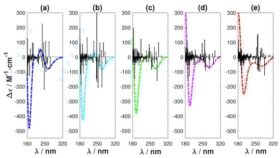 To investigate if the peculiar positive feature in the CAM-B3LYP spectra is due to the solution, we calculate the ECD in a solvent environment. We modeled water implicitly by a polarizable continuum model (PCM) []. Here we used a linear-response procedure, where the solvent effect on the self-consistent field (SCF), density of solute, is computed by adding the required terms to the TDDFT equations []. Figure A1 shows the effects of the implicit solvent model on the average ECD of ten sampled structures. The positive peak remains.