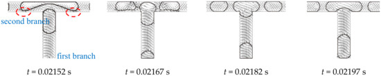 When the daughter bubbles flow to the second level bifurcation, combined behavior of obstructed breakup and tunnel breakup [28] is observed. As shown in Figure 3, t = 0.02182~0.02197 s, so that the second level branches are obstructed temporarily when the bubble is entering the bifurcation. However, as the bubble is stretched along the second branches, the volume of the bubble is insufficient to fully fill the second branches. Hence, gaps are observed between the bubble and the wall as illustrated inside the dashed line in Figure 3 at t = 0.02152 s. The gaps act as tunnels and hence the continuous fluid is able to circumvent the bubble into the second branches through these two tunnels. Once the tunnels are opened, the velocity of the continuous fluid increases rapidly crossing the tunnel leading to a high viscous force on the bubble in the second branches. Different from the obstructed breakup, pressure upstream of the bubble is released due to the tunnel. Moreover, vortexes are observed inside the stretching lobes of the bubbles (dashed line in Figure 3 t = 0.02242 s) which act as an obstruction to the further deformation and elongation of the bubble according to Chen and Deng [29]. Hence, bubble splitting requires longer time compared to that in the first bifurcation. The average time required in splitting one bubble in the second bifurcation is 0.0010591 s.