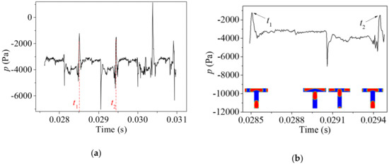 The pressure of the continuous phase upstream from the bubble at the bifurcation is essential during the breakup of bubbles [29]. Moreover, insufficient pressure leads to non-break behavior of bubbles [29]. Figure 5a gives the gauge pressure variation with time in several periods of bubble breakup at the center of the first bifurcation under the condition of Ca0 = 0.0111 so that the bubble undergoes obstructed breakup. As shown in the figure, the pressure varies periodically with a period T = t2 – t1 = 0.00094 s. To explore the pressure characteristics in one time period, the pressure and morphology evolutions of the bubble interface are shown in Figure 5b. t1 and t2 are the moments when the bubble is breaking up, and the pressure of reaches the maximum value during the whole breakup process. Initially, the pressure is relatively stable, resulting from the fact that the center of the bifurcation is filled with the continuous phases. As the bubble head enters the bifurcation, the pressure rises to a relatively high value and then fluctuates in a small amplitude. Afterward, the bubble head reaches the front wall of the channel and a sudden pressure drop is observed due to the stretching of the bubble inside the first branches. When the back of the bubble enters the bifurcation, the branches are obstructed by the bubble and hence a pressure increment is observed. During this period of time, the viscous force is competing with the interfacial tension and the curvature of the bubble back is varying with time. Hence the pressure is fluctuating at a bigger amplitude until the bubble breaks up.
