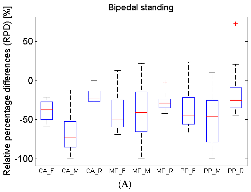 Boxplot of the relative percentage differences (RPD) obtained with each group of trials: bipedal standing (A), monopedal standing (B), and walking step (C). Individual boxplots are identified as CA-F (contact area of forefoot), CA-M (contact area of midfoot), CA-R (contact area of rearfoot), MP-F (mean pressure on forefoot), MP-M (mean pressure on midfoot), MP-R (mean pressure on rearfoot), PP-F (peak pressure on forefoot), PP-M (peak pressure on midfoot), and PP-M (peak pressure on rearfoot).
