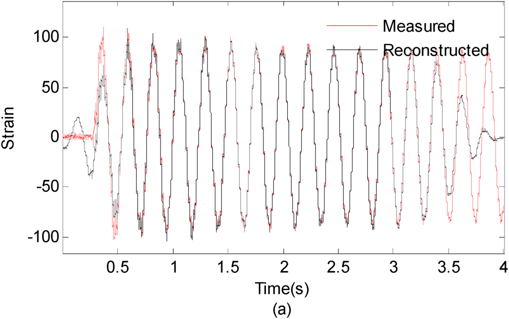 - In this study, a time domain strain/stress reconstruction method based on EMD is proposed. According to numerical analysis results, the proposed method can produce results which are very close to theoretical solutions considering a practical noisy measurement system. The reconstructed results have an overall correlation coefficient larger than 0.975 under 10% RMS noise settings. The discrepancy between actual measurements and reconstruction results at the boundary region are possibly caused by the end boundary effect of EMD method.
