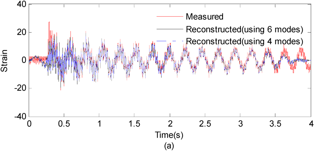 (a) Measured strain responses and reconstructed responses using six modes and four modes; (0~4 s) (b) Results are concentrated on 1.5~2 s for clear presentation.