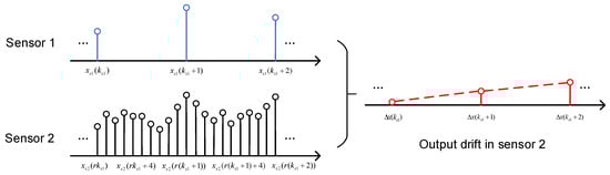 where is the index of the data obtained from the low-sample-rate sensor; is the ratio of the high sample rate to the low sample rate; and are the vibration signals measured by the low-sample-rate sensor and the high-sample-rate sensor, respectively; and are the measurement noise (band-limited white noise) of the low-sample-rate sensor and the high-sample-rate sensor, respectively; and is the output drift of Sensor 2. Subtracting Equation (1) from Equation (2), the difference between data from Sensor 1 and Sensor 2 is given by: