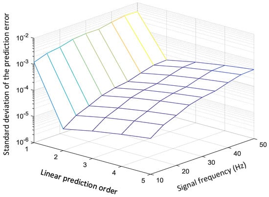 Given the sample frequency of the high-dynamic sensor, the covariance matrix of the prediction error is influenced by the order of the linear prediction model and the signal frequency. For a th-order linear prediction model, each current datum is a combination of previous data and the j-th combination coefficient is as shown in Equation (13). The simplest case is . In this case, to achieve a prediction error smaller than 0.001, the ratio of the sample rate to the signal frequency must be larger than 1000. The solution to this problem is to increase the order of the prediction model. A simulation result indicating the effect of the linear prediction order and signal frequency on prediction error is shown in Figure 4. In this figure, the sample rate is fixed at 10 kHz. Band-limited random signals, whose highest frequency changes from 10 Hz to 50 Hz, are used to compare the prediction errors of different orders.