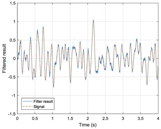 Following the drift-state estimation process, the drift-removed data of Sensor 2 are then processed using a linear-prediction-based Kalman filter. Two parameters are considered in this stage: the covariance matrix of the state transmission error and the covariance matrix of the observation error. The covariance matrix is adjusted according to the linear prediction order and the signal frequency band, which is shown in Figure 4. The observation error is decided by the measurement noise of Sensor 2, which is in this simulation. The simulation result is shown in Figure 7. The simulation result shows that the output drift has been removed and the measurement noise has improved 9.3 dB (compared with that in Figure 5b). The root-mean-square error (RMSE) of the filtering result is 0.0342. In addition, the latency of the linear-prediction-based Kalman filter is 1 sample. This would be a useful characteristic when the system is used in a feedback control loop.