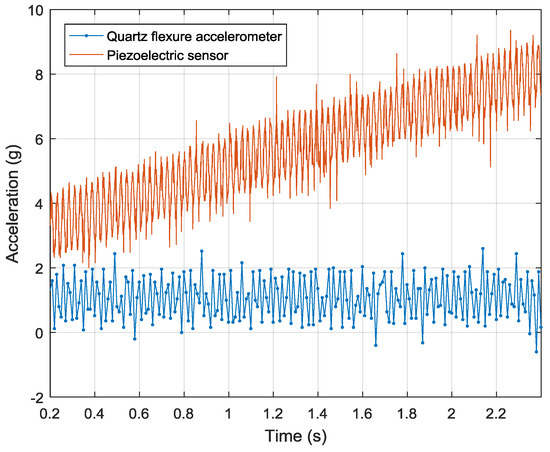 The original data of quartz flexure accelerometer and piezoelectric sensor are shown in Figure 10. The output of piezoelectric sensor is sampled by the oscilloscope at a sample rate of 1000 Hz. The output of quartz flexure accelerometer is sampled at a synchronized rate of 1000 Hz, and then down sampled to 100 Hz. Hence, the ratio of the high sample rate to the low sample rate is 10. These two sensors are tested by a sinusoid acceleration signal generated by the shaking table. The frequency of the sinusoid signal is 40 Hz, and the peak-to-peak amplitude is 2 g. Limited by the memory depth, the total sampling time is 2.2 s. Still, the drifts of these two sensors can be compared. By applying a linear fitting to the data of piezoelectric sensor, the drift of piezoelectric sensor is 2.2 g/s. The output of quartz flexure accelerometer keeps stable in this very short time.