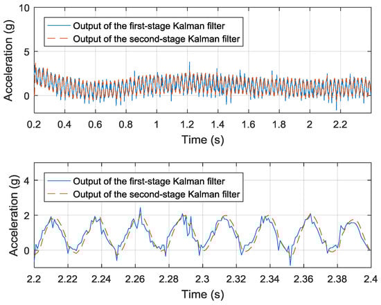 The result of the drift-state estimation process is shown in Figure 11. Subtracting the data of quartz flexure accelerometer from the data of piezoelectric sensor gives the observation data, which is the blue solid line shown in Figure 11. The first-stage Kalman filter investigated in simulation is applied to this observation data. Several key parameters of this Kalman filter are modified according to the experimental data. The observation covariance matrix is changed to 0.11 as the RMSE of observation data is 0.33 g. The covariance matrix of state transmission error is assigned 1 × 10−6 along the diagonals and 0 elsewhere, because the state vector keeps stable in this very short time. The state vector starts from a random vector initially, and it ends to be at time 2.4 s. The drift estimation of piezoelectric sensor, which is plotted by red dashed line, converges to the trend of drift as more observation data are obtained.