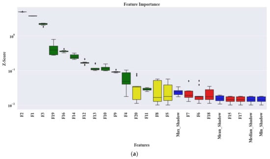 A wrapper approach usually uses a non-parametric classifier for the selection of important features from the complete feature pool. The reason behind considering a non-parametric classifier is to reduce the computational complexity [], along with avoiding the multicollinearity problem []. Boruta is a wrapper-based approach that uses the Random Forest (RF) classifier for the feature selection process. This algorithm first shuffles and permutes all the original feature attributes to create a randomized copy of original feature set. Then, this randomized set of features is added to the original feature set to bring randomness to the feature attributes. Finally, it performs the feature selection process by the RF classifier on those attributes []. Thus, by adding randomness to the feature attributes, this algorithm outperforms the conventional forward/backward selection-based wrapper approaches [,]. The steps of the Boruta algorithm are described below:
