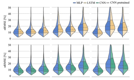 Inertial sensor data were simulated based on marker trajectories placed on the pelvis, thighs and shanks in a multi-step process. In step one, the segment coordinate systems of the hip, knee and ankle joints are determined [] as quaternions. These coordinate systems are translated and rotated in the subsequent step to match sensor positions and initial orientations used during the data collection using an optimisation approach. The dataset used in this study contains ground-truth inertial sensor data from 23 participants. To ensure a wide variability in the range of synthesised IMU data, the initial position and orientation were optimised to match each participant’s ground truth sensor position and orientation. Thus, all 23 slightly different positions and orientations of the ground truth data were simulated for each participant in the motion capture dataset. This resulted in data augmentation by a factor of 23. In a final step, the quaternion derivative was calculated to determine the angular rate, and the second derivative of the simulated sensor’s origin was used to calculate the acceleration of the simulated sensor. For a more detailed description of the simulation refer to Mundt et al. []. The simulated data comprised 3D acceleration and 3D angular rate of five sensors—an input matrix containing 30 time series features. The output matrix (joint angles or joint moments of the bilateral hip, knee and ankle joint) contained 18 time series features. All data was time normalised to stance (kinetics) or step (kinematics) phases resulting in time series of 101 data points.