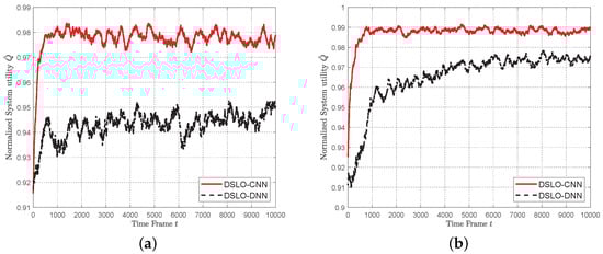 In Figure 8, we evaluate the effect of BN in both DSLO algorithms. BN greatly improves the convergence performance of DSLO in metrics of both convergence speed and the optimal system utility. As shown in Figure 8a, with the BN structure, the training time of DSLO-CNN reduces from 4000 time frames to 1000 time frames. As shown in Figure 8b, models that do not contain BN layers have a high tendency to fall into local optima in the training phase.