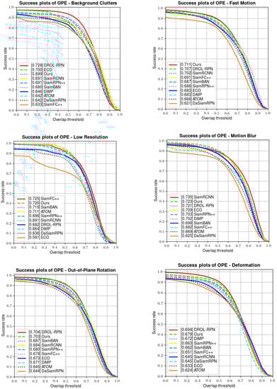 Apart from the above results, OTB100 also provides several attributes to test the robustness of each tracker in dealing with unpredictable challenges (including illumination variation, fast motion, scale variation, etc.). A series of comparisons are made in Figure 6 below; our tracker manifests favorable performances when handling fast motion, deformation, rotation, out-of-view, illumination variation, and scale variation, and also achieves a competitive performance in solving background clutter and low-resolution situations.