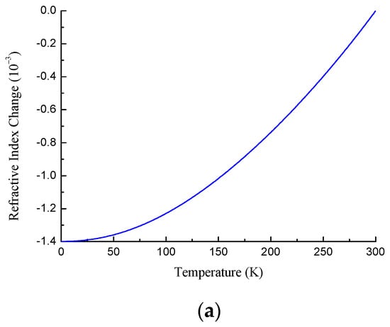 where the temperature is measured in Kelvin. There is no linear term in this sum, because it is known that the thermo-optic coefficient goes to zero as the temperature approaches 0 K [,,]. The curve has a parabola shape at 0 K. This is experimentally corroborated by the fact that gratings are essentially insensitive to temperature changes near 0 K [,,,]. Thus, we extrapolated the refractive indices down to 0 K and the results show that the equation obtained by Leviton and Frey may be applied to lower temperatures.