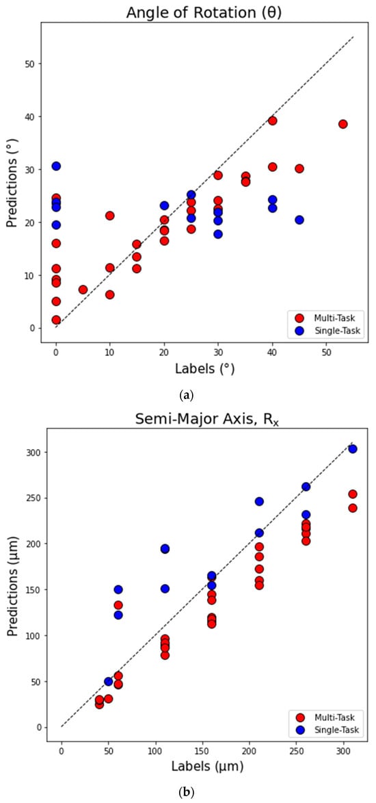 For further visualization of the results, we show the scatterplots for the holdout testing data predictions vs. labels (i.e., true values) for the angle of rotation θ (measured in degrees), semi-major axis Rx, and semi-minor axis Ry (measured in microns) in Figure 7a,b,c, respectively. Each point in the scatterplot represents a single testing instance from the test dataset. In all figures, the results obtained with MTL and single-task networks are indicated with red and blue circles, respectively. The values of Pearson r and Spearman r correlation coefficients for predictions of θ, Rx, and Ry with single-task and multi-task networks for the scatterplots in Figure 7 are listed in Table 2. For reference, a dashed line indicating prediction = labels is drawn in all figures. As can be seen in Figure 7a and the corresponding entries in Table 2, there is a substantial improvement in predicting θ by utilizing the MTL network. The angle θ was poorly predicted by a single-task CNN, while the MTL network produces a much stronger linear correlation between predictions and labels. From Figure 7a, the most challenging cases for prediction for the MTL network are those with θ < 10o and θ > 35o. For smaller angles, MTL overpredicts, while for larger angles, MTL underpredicts the results. The same pattern of errors angle predictions is observed for the performance of a single-task network. Results for the predictions of Rx and Ry with multi-task and single-task networks are shown in scatterplots in Figure 7b,c. Corresponding values of the Pearson r and Spearman r correlation coefficients in Table 2 indicate that while the single-task network was able to perform reasonably well in predicting the radii, the multi-task network provides a further performance improvement. From Figure 7b,c, performance of the MTL network gradually decreases with increasing length for both Rx and Ry. The error in MTL for both Rx and Ry is mostly under -prediction of true values, while for single-task CNN networks the error is mostly over-prediction for Rx and under-prediction for Ry.
