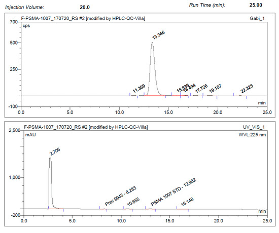 Typical chromatograms from the analytical radio-HPLC of [18F]PSMA-1007 after preparation by the two-step process on the AllInOne radiosynthesiser are shown in Figure 1.
