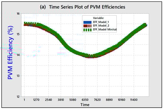 (a) Time series plot of module efficiency (Model 1); (b) efficiency over module temperature.